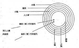這個圖也是在顯示傷寒論中的六經病,病邪自表走裡的關係。此同心圓是用來表示病的層次關係,而無關經絡。
