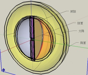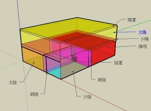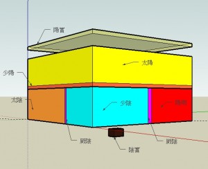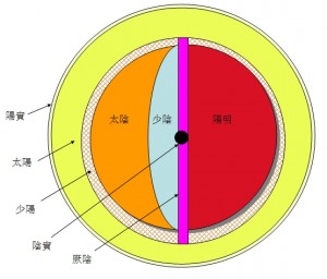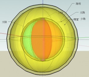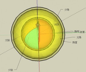 外層為太陽,其外有一薄層為陽實。第二層為少陽,以網狀代表。中間的球分作三份,分別是陽明、太陰和少陰。陽明佔半球,太陰佔1/3,少陰佔1/6。中軸之處,則為厥陰。另有一小球位於球心,則為陰實。