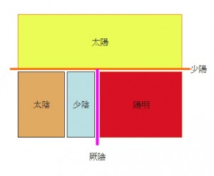 "請以地理喻,六經猶列國也。腰以上為三陽地面,三陽主外而本乎裡。心者,三陽夾界之地也。內由心胸,外自巔頂, 前至額顱,後至肩背,下及于足,內合膀胱,是太陽地面。……腰以下為三陰地面,三陰主裡而不及外。腹者,三陰夾界之地也。……若經絡之經,是六經道路,非六經地面也。……"